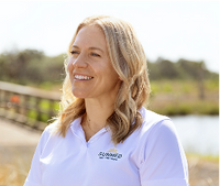 Smiling woman in a white polo shirt stands next to a 30-day refund guarantee message with a signature, highlighting Sunmed CBD’s Sunset Daze Delta 9 THC Seltzer Strawberry Lemonade.